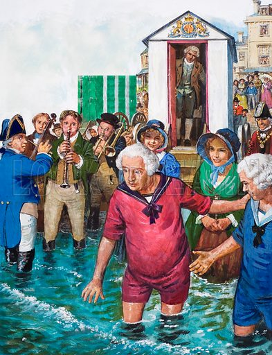 It wasn’t long after this that the bathing ‘machine’ was invented to offer greater privacy to those taking a therapeutic dip. In its original form this horse drawn carriage featured an enclosed room with a collapsible hood at the seaward end to shield patients as they were submitted naked to the waves by burly attendants called dippers. In 1789 George III gave royal approval to the new fashion when he took a medicinal bath at Weymouth to the musical accompaniment of ‘God Save the King.’